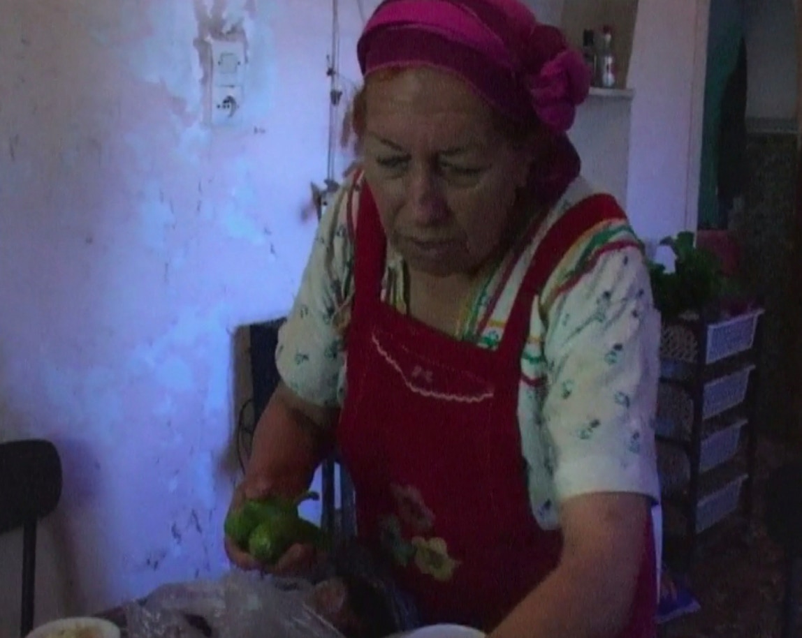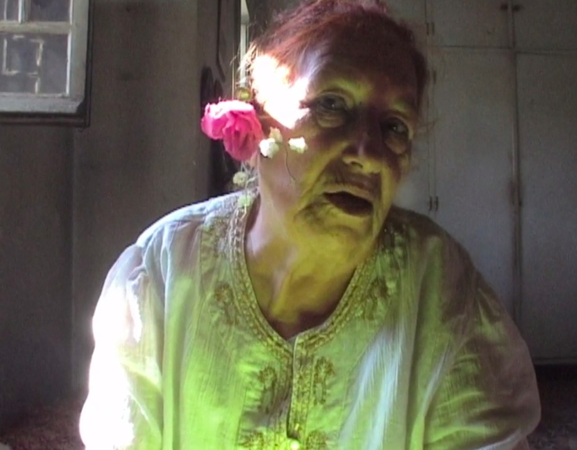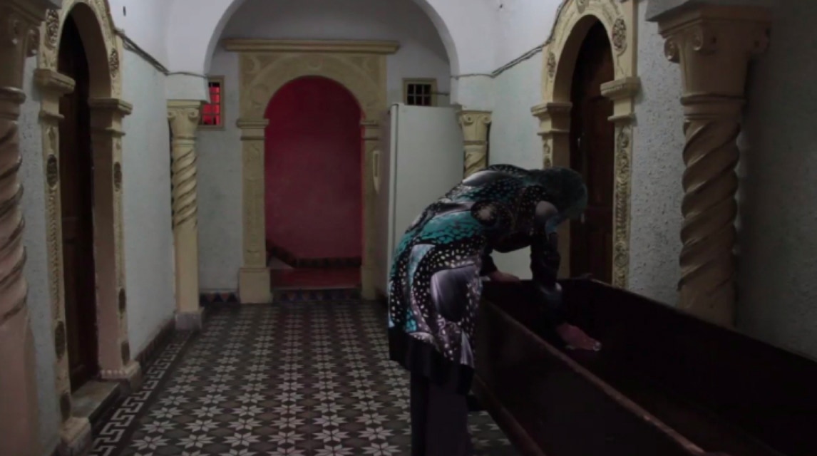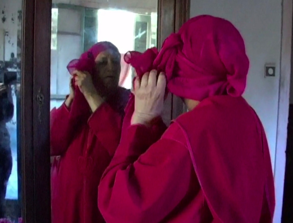 Et oui c'est vrai c'est moi. Mais elle n'est pas décédé à ce moment là. Et il l'a senti. Elle est derrière le rideau, allongée. Et ça m'a scotché. Il m'a dit c'est toi, j'arrive à reconnaître tes plans. Elle est vivante encore, mais elle est malade et elle dort. On ne la voit pas ; elle est derrière le rideau, et je filme ce balancement dans lequel elle apparaît en portrait. Il y a Sarah, la fille de Nora dans la cuisine. On la voit de dos. Avant c'est moi qui faisais la cuisine, là c'est elle qui fait la vaisselle. On ne sait pas dans quel temps on est et je pense qu'on oublie Sarah, alors qu'on la retrouvera en train de nettoyer le mahmel, la boite en bois. Je filme ces plans là. C'est la période où elle est malade et je vais la voir quasiment trois à quatre fois par semaine. Les cinq, six derniers mois j'étais quasiment tout le temps en Algérie. Je suis revenue deux fois en France. Vite fait. Je ne le raconte jamais mais je suis restée vraiment avec Nora, Sarah et elle, tout ces derniers mois où elle était encore debout. Jusqu'à ce qu'elle ne puisse plus bouger, plus manger, plus rien, j'allais encore la voir. Ça ne fait pas partie du film. Il n'y a que le moment du rideau et quelques plans dans la cuisine, le hall etc....